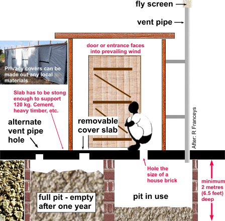 The floor slab has to be constructed from material strong enough (obviously) to support the weight of an adult and a concrete slab is ideal. The squat–hole should not be too large, about the size of a building brick. It helps positioning to place a couple of wooden blocks as guides for the feet. A further refinement would be a grab handle or back support. If neither of these is possible, a good technique is to lower trousers or pants to below the knees and to take a firm hold of the waistband, this improves balance. The squat–hole should be covered with a stone or slab to reduce the number of insects attracted to the latrine.