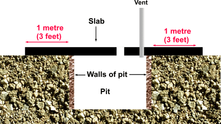 The pit must not cave in and if a deep pit is dug or the ground is soft, the pit walls must be supported. The best shape for the pit is circular, as this gives the strongest structure. Just the upper half of the latrine can be lined or, if necessary, it can be lined all the way down the pit. You can use all kinds of different materials to line the pit: bricks, blocks, oil drums, concrete rings, bamboo or similar basketwork and stones. Test it before anyone uses it by placing planks over the pit and jumping up and down for some minutes, then look in the pit. If any soil has fallen in then that part of the wall needs further reinforcing. If the ground is heavy clay and very solid to excavate even in wet weather, then no lining is necessary. The slab should extend 1 metre (3.3 feet) over the outer walls of the pit, so if there is subsidence, no one in the latrine will fall into the hole; see diagram below.