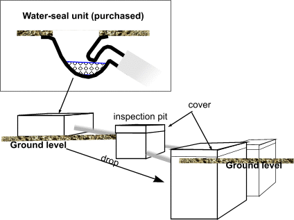 The wet VIP latrineThe wet VIP latrine (see diagram below) uses a water sealed unit (similar to a household toilet) that is connected to an outlet pipe, which in turn is connected to a storage pit. This latrine is flushed by pouring water into the bowl. The waste is washed down the outlet pipe, via an inspection pit, into the storage pit. Usually, two storage pits are dug, one being sealed off. When the first pit is full, it is sealed and the flow of waste is directed to the second pit. The first pit can be emptied after one year, this then becomes the latrine and the second one is sealed off and left for a year before being emptied. The advantage of this latrine, which is a more long–term sanitation solution, is that there is less smell as the water sealed unit stops methane gas from filling the latrine area so it can be located in or near a building. The storage pits must be located well away from any living area. The inspection pit also allows any blockage in the outlet pipe to be rodded clear. Because water is used to flush the latrine, the storage pits must have good drainage into the subsoil otherwise the pit rapidly fills. There is considerable pollution of the ground near the storage pits so they need careful location.